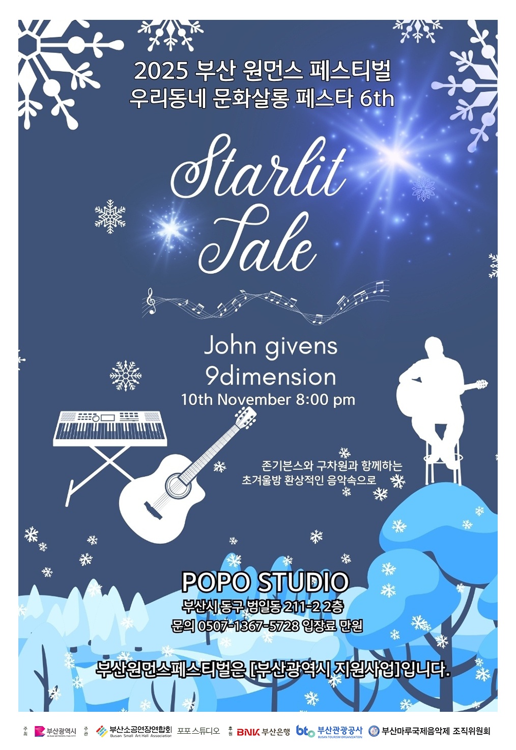 - 한 편의 동화처럼 여러분들을 음악 속 이야기로 초대합니다. 별빛이 수놓인 밤, 조용히 스며드는 멜로디와 감미로운 보컬, 이 공연은 마음을 어루만지는 마법같은 순간을 선사합니다. 현실은 잠시 멈추고, 한 사람 한 사람의 가슴속에 따뜻한 울림을 남길 라이브를 기대해 주세요.